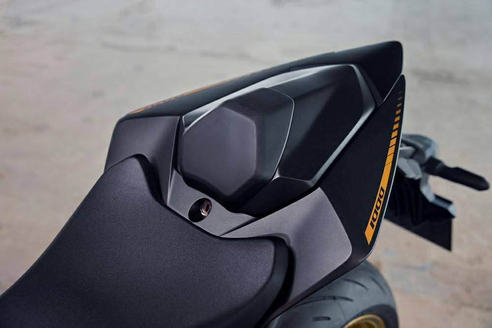 Дизайн Honda CB1000 Hornet 2025 года — это образец современного минимализма и агрессии, полностью лишённый ретро-нот предшественника. Мотоцикл получил полностью новый, переосмысленный облик в стиле «streetfighter», который дизайнеры описывают двумя словами: «агрессивный» и «чистый». Главный акцент — это «жалящий взгляд» суперкомпактных сдвоенных LED-проекционных фар, которые и задают весь характер байка. Фирменный бензобак Hornet, широкий в передней части и плавно сужающийся к коленям водителя, создаёт ощущение надёжной хватки и традиционно узкой «осиной» талии, характерной для этой модели. Минималистичное седло и чёрная решётчатая подрамник дополняют этот образ. Дизайнеры даже сделали раму частью экстерьера, оставив её видимой, что подчёркивает технологичность конструкции. Двигатель, колёса и маятник также выполнены в чёрном цвете, создавая монолитный и мрачный вид. Стандартная версия доступна в трёх цветовых вариантах: Grand Prix Red, Mat Iridium Gray Metallic и Pearl Glare White. Версия SP предлагается исключительно в чёрном матовом цвете с золотистыми элементами (колёса, вилка, маятник), что придаёт мотоциклу ещё более эксклюзивный и сдержанно-злой вид.