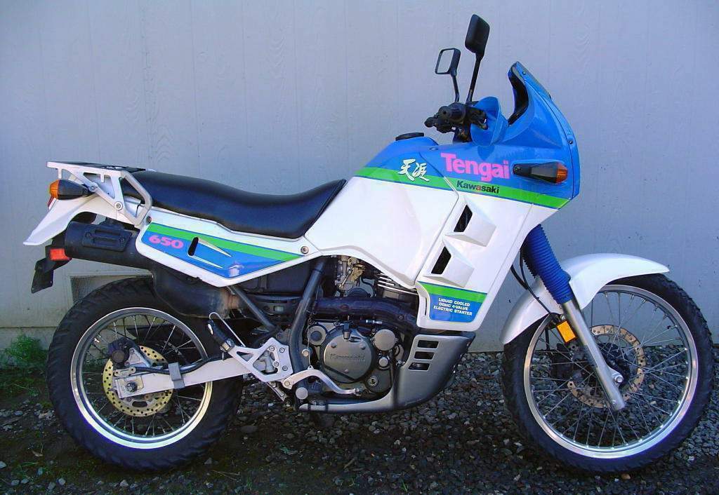 Tengai это приключение универсальная версия долгоживущей KLR 650 enduro. Этот мотоцикл Кавасаки оснащен 24-литровым баком и немного отличается от базовой модели пластиком, улучшающим защиту от ветра. Ход подвески несколько в сравнении с обычным KLR. Кроме пластика, в этой версии байка так же отличается дизайн защиты картера. Двигатель расчитан на нагрузки для крутящего момента в низком регистре. Будучи немного света на заднем колесе, мотоцикл просто просит власти скользит по грунтовым дорогам. Tengai чувствует себя заметно легче, чем Transalp, хотя разница в реальный вес всего десять килограммов или около того. Она имеет более мачо или грубый характер, чем Transalp. Этот трактор слишком тяжелый для настоящих внедорожных приключений. Это в лучшем случае на гравийных дорогах, начиная от сырых джипах трасс до больших и быстрых маршрутов. Я наслаждался на Neste Rally Finland этапов на следующий день после мероприятия. Tengai очень легкий и юркий на дорогах с твердым покрытием, что делает его легко вытащить через кривые и изменить путь вождения быстро, если это необходимо. На шоссе вы начинаете понимать, что мотоцикл имеет после всего лишь 40 лошадей в конюшню и давление ветра делает иначе расслабленное положение вождения меньше, чем комфортно. Максимальная скорость составляет 160 км / ч в зависимости от спидометра, может быть, 145 реальная км / ч. Двигатель довольно приемистый и она тянет без колебаний от 3000 оборотов в минуту вверх. Если в спешке вы хотите остаться выше 5000 оборотов в минуту. Двигатель набирает обороты бодро весь путь до красной линии со скоростью 7500 оборотов в минуту. Машина вибрирует достаточно, чтобы держать зеркала тусклый более или менее во всех условиях. Подножках и рули чувствуют себя хорошо, хотя. Я не хочу, чтобы представить себе, что машина будет походить без встроенных уравновешивающих валов.