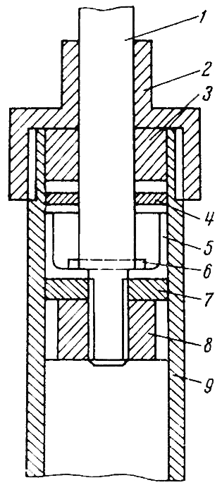 Переделка амортизатора передней вилки: 1 — шток; 2 — наконечник; 3 — верхнее кольцо; 4 — шайба; 5 — клапан; 6 — шпонка; 7 — нижнее кольцо; 8 — поршень; 9 — корпус амортизатора.