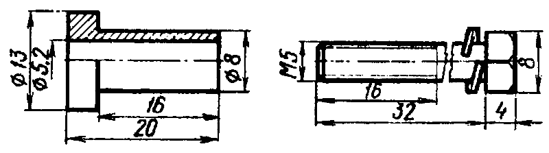 Отрегулировав зазор, как предлагает инструкция, и затянув винт, крепящий стойку, снимаю технологический кулачок, закрепляю на корпусе провод низкого напряжения и устанавливаю корпус прерывателя на свое место. Однако при снятии и установке корпуса прерывателя так же неудобно добираться к двум винтам его крепления. Я заменил их болтами М5 с головкой под ключ на 8 мм, которые предварительно вставляю в дистанционные втулки, изображенные на рис. 2. Теперь монтаж и демонтаж корпуса прерывателя становится удобным и быстрым, ускоряется установка момента зажигания.