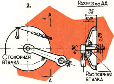 Далее протачиваю отверстие ступицы до диаметра 30 мм. Затем вытачивают стальную втулку и запрессовывают в отверстие, как показано на рис. 2. Тормозной диск собирают и устанавливают на ось коляски так, чтобы тормозной рычажок находился наверху, а конец оси тормозных колодок — под рычагом торсиона (рис. 2).