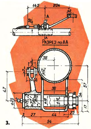 Конструкция педали и ее крепление показаны на рис. 3. Изготовить ее можно в любых мастерских, где имеются сварка, токарный и сверлильный станки.
