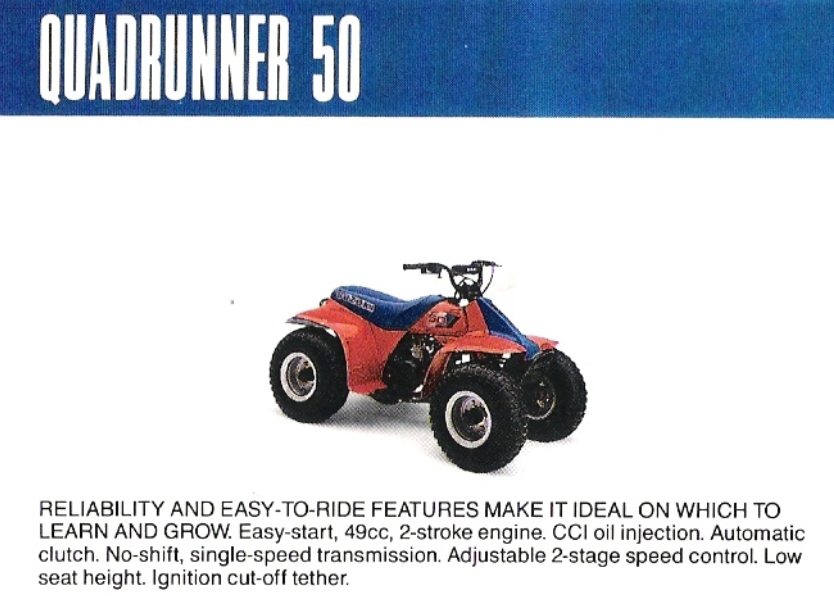 Suzuki QUADRUNNER 50 не продающийся в России мотоцикл . Несмотря на то, что хорошие модели мотоциклов отличаются весьма солидной ценой, а сезон их использования относительно короткий, рынок мототехники стремительно развивается. А если верить словам дилеров, то некоторые модели недавно выпущенных мотоциклов в начале сезона расходятся как горячие пирожки, и привезенных в Россию моделей явно не хватает для полного удовлетворения потребительского спроса.